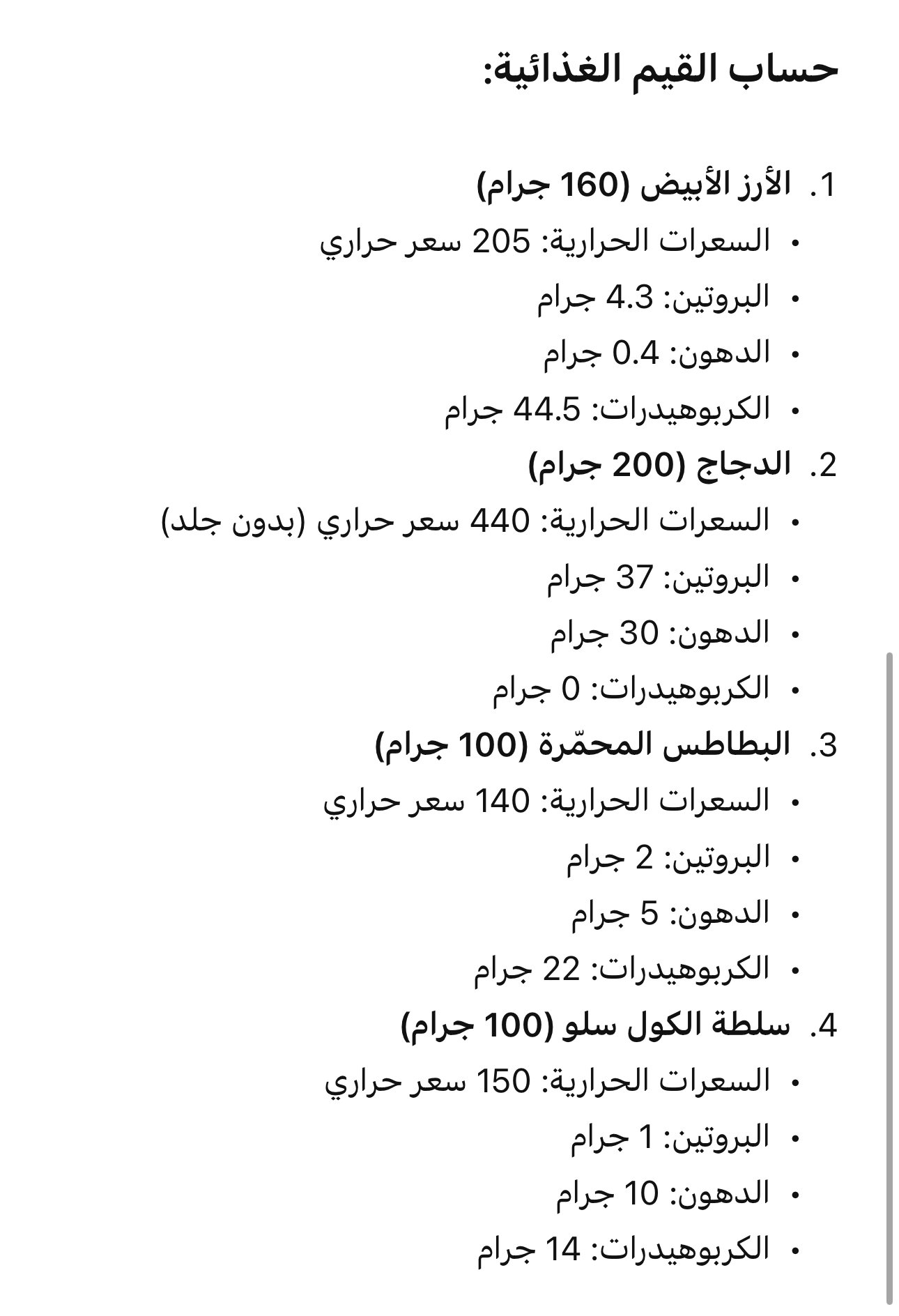 إذا كنت قد تناولت وجبة تتضمن صدر دجاج، أرز، وخضروات، يمكنك تصوير الوجبة ورفع الصورة إلى شات جي بي تي. خلال لحظات، ستحصل على تحليل دقيق يشمل: